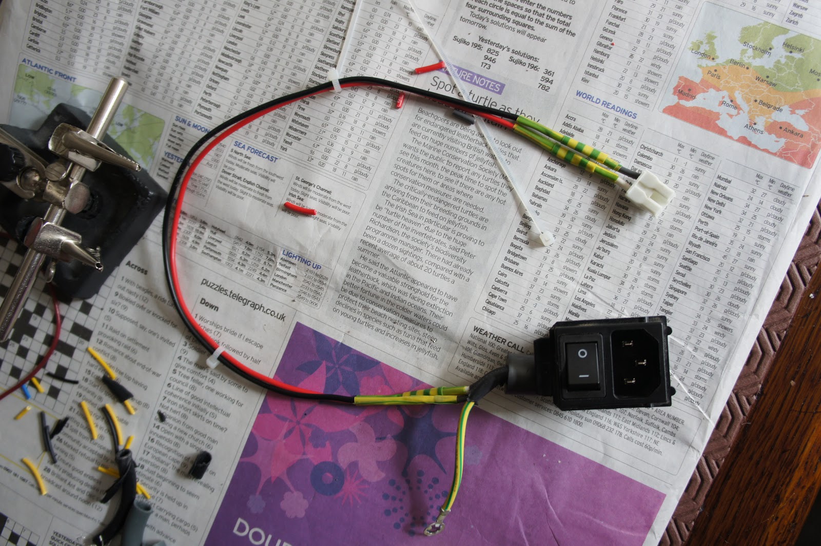 To be able to have the ps3 psu in the case, I needed to run cables between the plug on the motherboard and the socket on the psu. I used the thicker gauge wire to do that.The wire is soldering onto some thing strips of brass, which have been slightly bent with pliers so that they stay in the plug sockets. You may be able to just make out that I marked on the psu which hole was which so they didnt get plugged into the wrong sockets. For those of you thinking this looks rather dodgy, I did create a slapdash sort of plug using tape to hold them safely in the socket and to ensure they could not come into contact with each other or anything else.